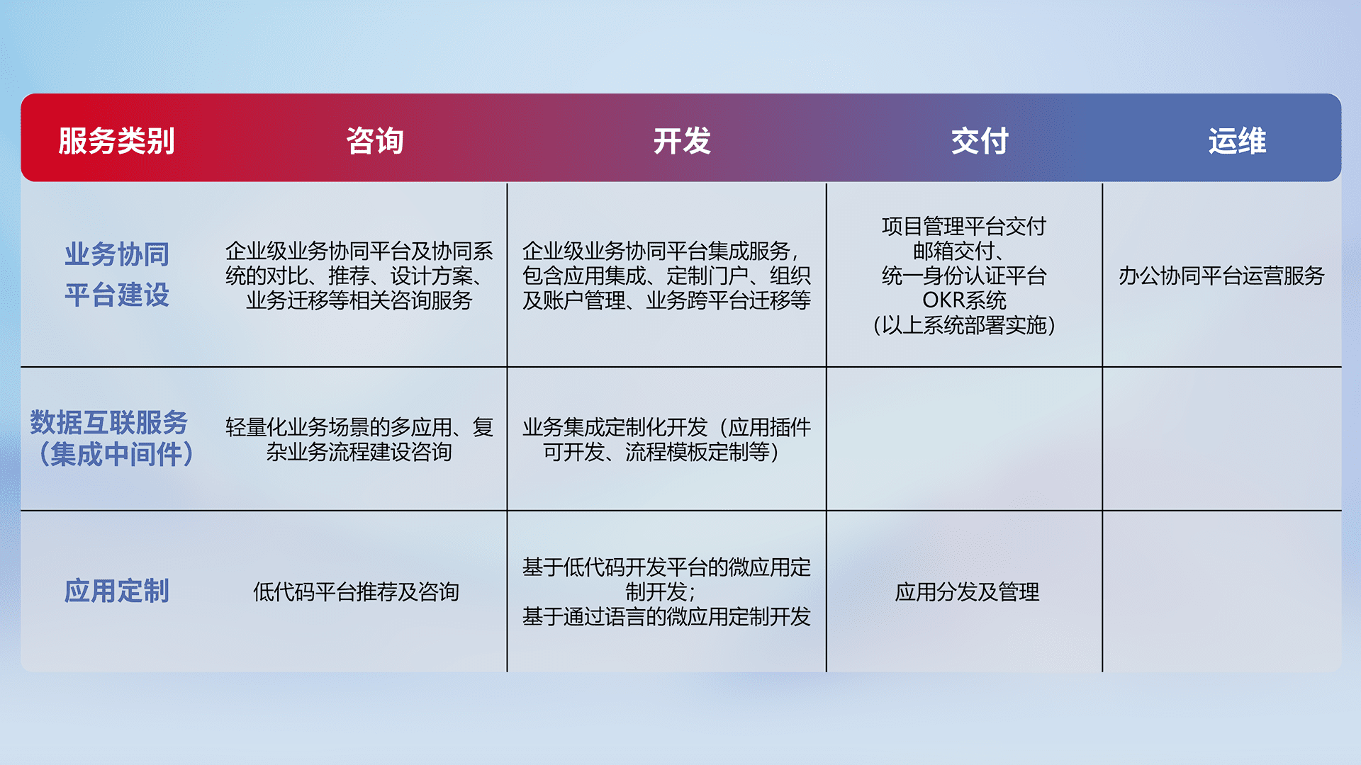 针对钉钉、、企微、、IDaas等平台级产品提供产品的规划、、、、方案、、交付、、、定制化开发等服务,,实现如统一协同办公、、智能客户服务、、、混合会议管理、、、智能数据查询、、等业务场景,,,,实现数字化转型。。。